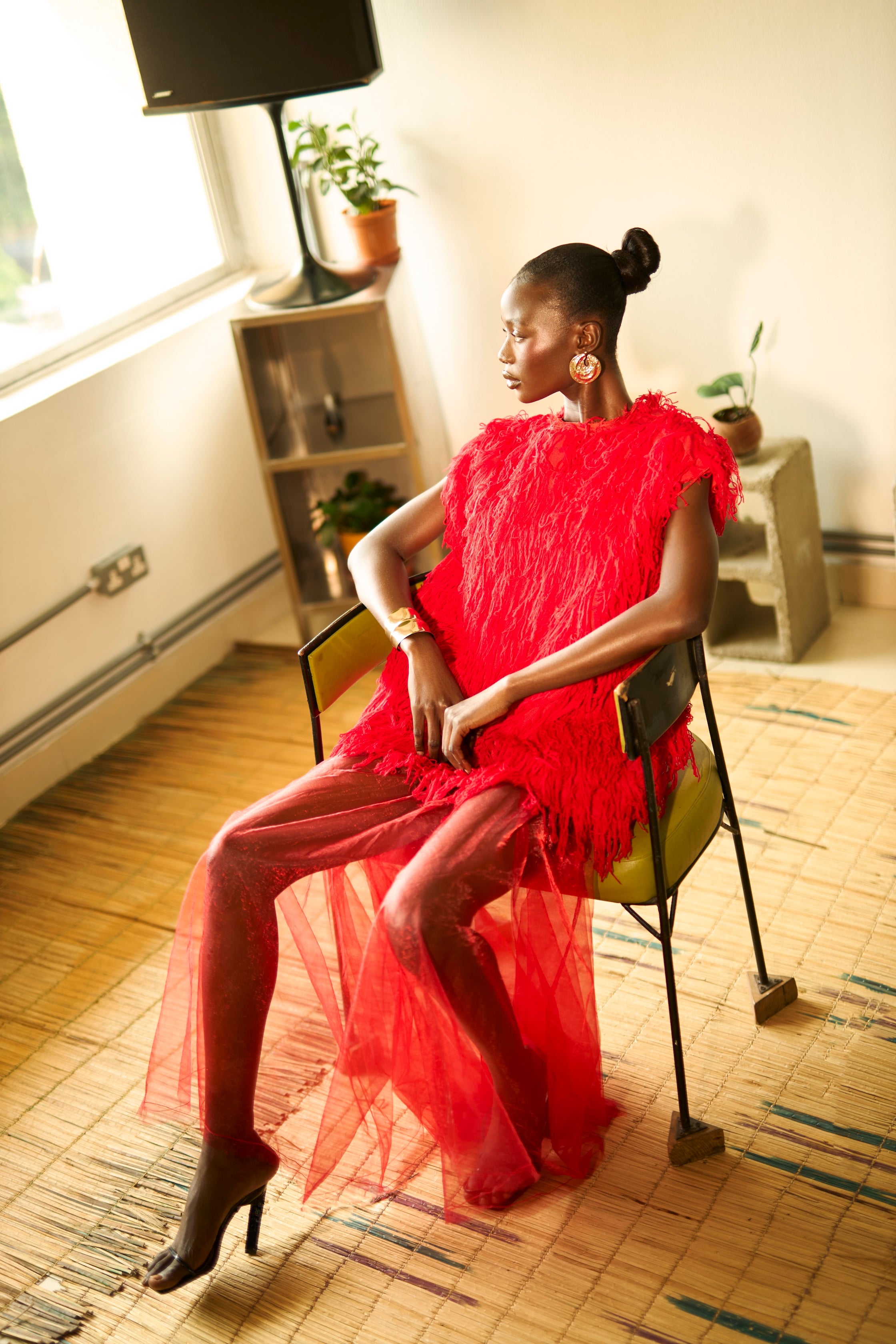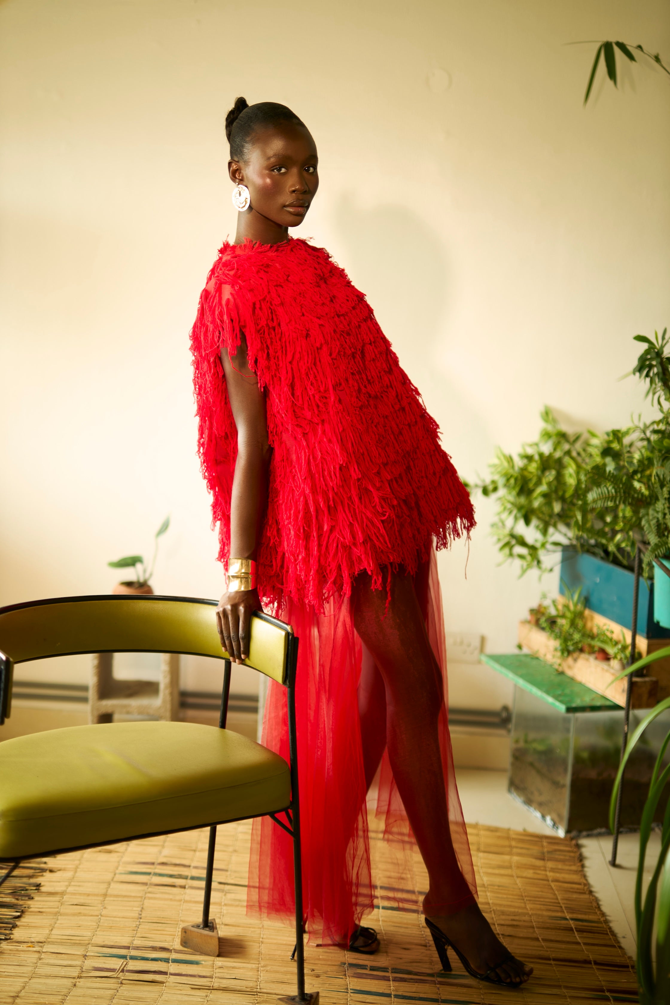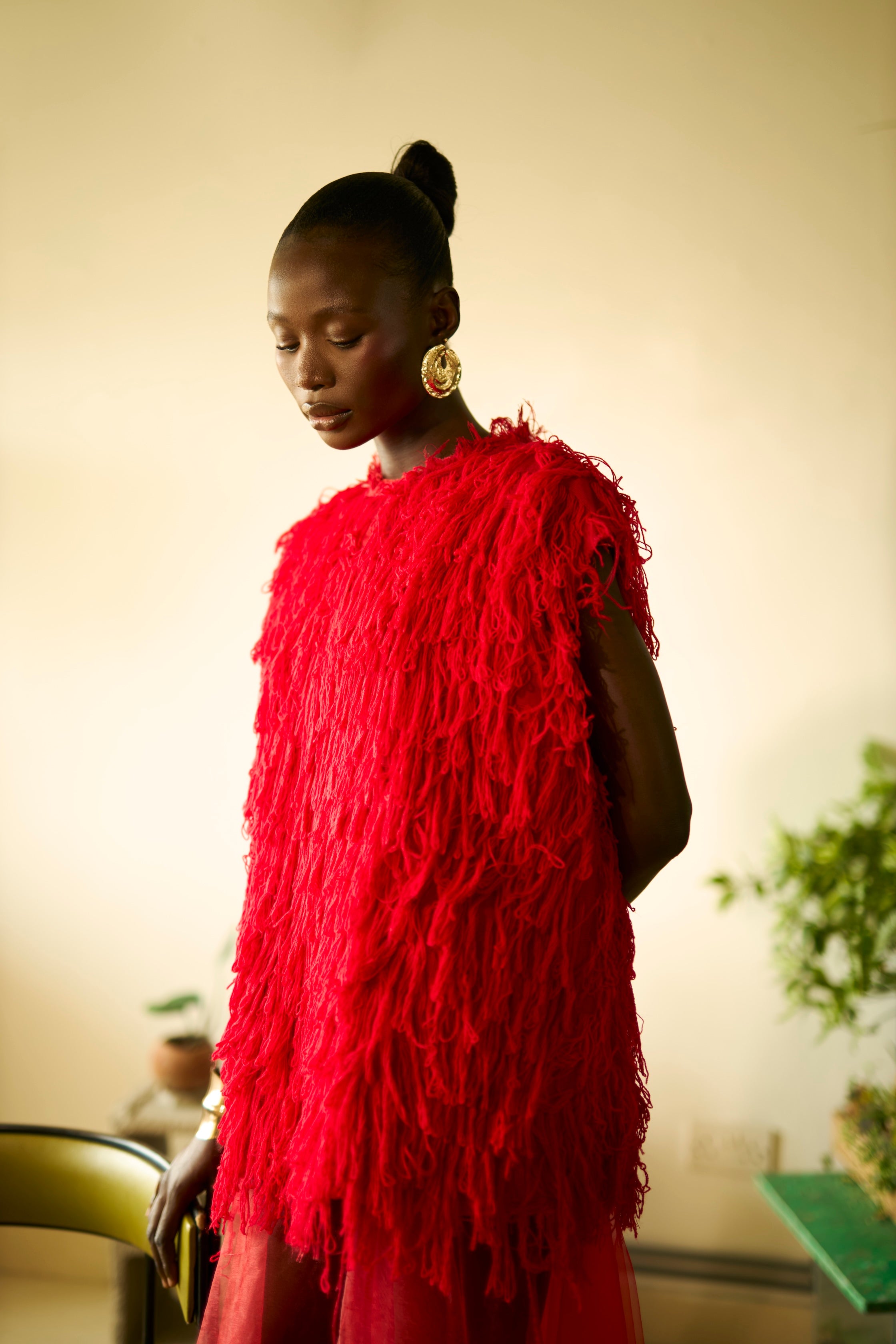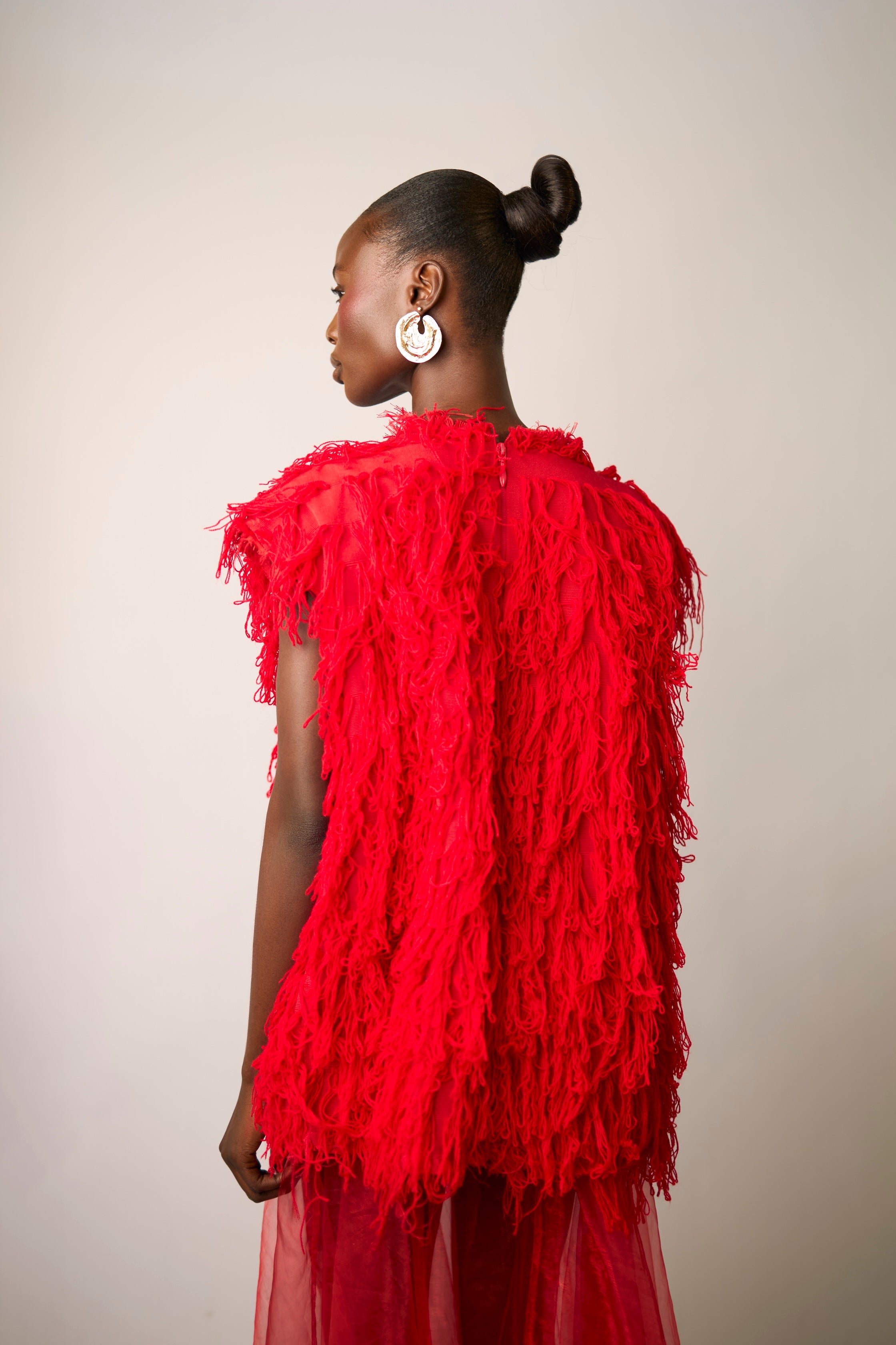 A statement top featuring a specialized woven and fringed 3D cotton Aso-Oke top with an oversized fit. Designed to create texture, movement, and bold visual impact.